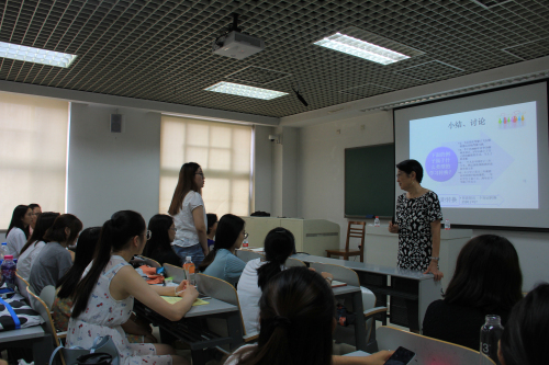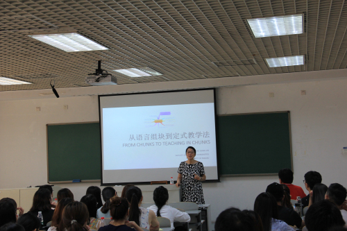 师生做了两场讲座。上午,靳教授做了题为“对外汉语教学的关键一环:从语言组块理论到定式教学应用”的讲座。在此次讲座中,靳教授首先从汉语国际教育的宏观发展谈起,为大家介绍了国际汉语教育事业的蓬勃发展,然后详细讲解了语言组块和定式教学法等相关的概念和课堂教学方法,如语言组块与定式教学的关系、定式的选择方法与标准、定式的呈现方法及原则等。