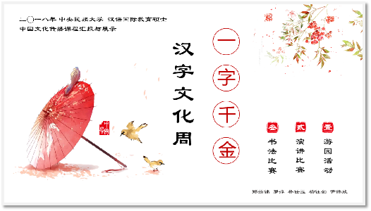 “活动策划类”汇报展示有“汉字文化周的组织策划”与“海外活动设计”两种形式。“汉字文化周”以“一字千金”为主题,以“游园+比赛”的形式,创意性地开展汉字教学;“海外活动设计”则以佐治亚州立大学孔子做爱影片等为例,展示了第九届联合国中文日、中秋节的活动策划方案。两组同学的汇报条理清晰,内容详实,为大家日后的教学实践活动提供了新思路。