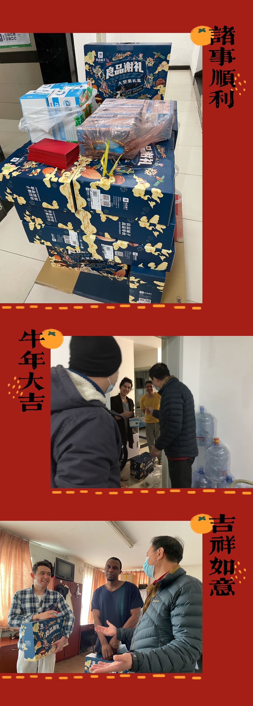 党总支书记周铁海率副院长兼党总支副书记李锷、党团与学生工作办公室主任买力克和国际公寓管理办公室主任白瑞坤来到西门留学生公寓,亲切慰问留校国际学生,向不远万里来中国求学的学子们送上民大的亲切问候和节日祝福。周铁海书记亲手将精心准备的“春节大礼包”——节日免费餐券、防疫口罩和幸福礼包递到每位国际学生手里。他在向同学们致以节日问候的同时,还叮嘱同学们继续严格遵守学校的疫情防控规定,有困难及时联系做爱影片老师,愿同学们度过一个欢乐祥和的春节。